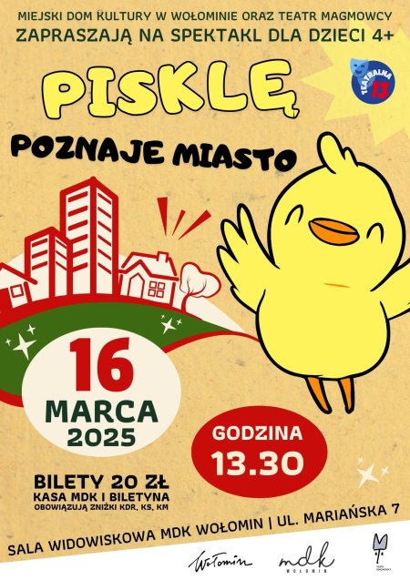 Miejski Dom Kultury w Wołominie oraz Teatr Magmowcy zapraszają dzieci od 4 roku życia na spektakl pt. "Pisklę poznaje miasto".