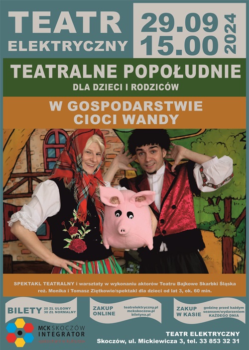 „W gospodarstwie cioci Wandy” - spektakl połączony z warsztatami w wykonaniu aktorów Teatru „Bajkowe Skarbki Śląska”, reż. Monika i Tomasz Ziętkowie /spektakl dla dzieci od lat 3, ok. 60 min/. Organizator: MCK „Integrator”.