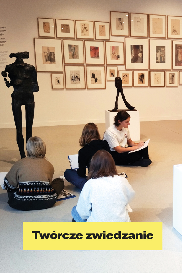 Młodzież od 14. roku życia zapraszamy na „Twórcze zwiedzanie”, które obejmuje zwiedzanie z przewodnikiem, bazujące na autorskich kartach pracy. W czasie zajęć uczestnicy_czki rozwijają uważność, odkrywają nowe spojrzenie na dzieła sztuki, angażują się w pracę z materiałami oraz współpracują w grupie, tworząc wspólne działania artystyczne. Program wprowadza w świat sztuki w sposób przystępny i inspirujący, dostosowany do wieku uczestników.