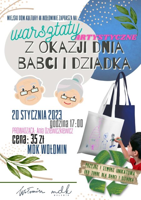 20 stycznia o godzinie 17:00 przyjdź do Miejskiego Domu Kultury w Wołominie i stwórz unikatową eko torbę, która będzie znakomitym prezentem dla Twojej Babci i Dziadka, w dniu ich święta.