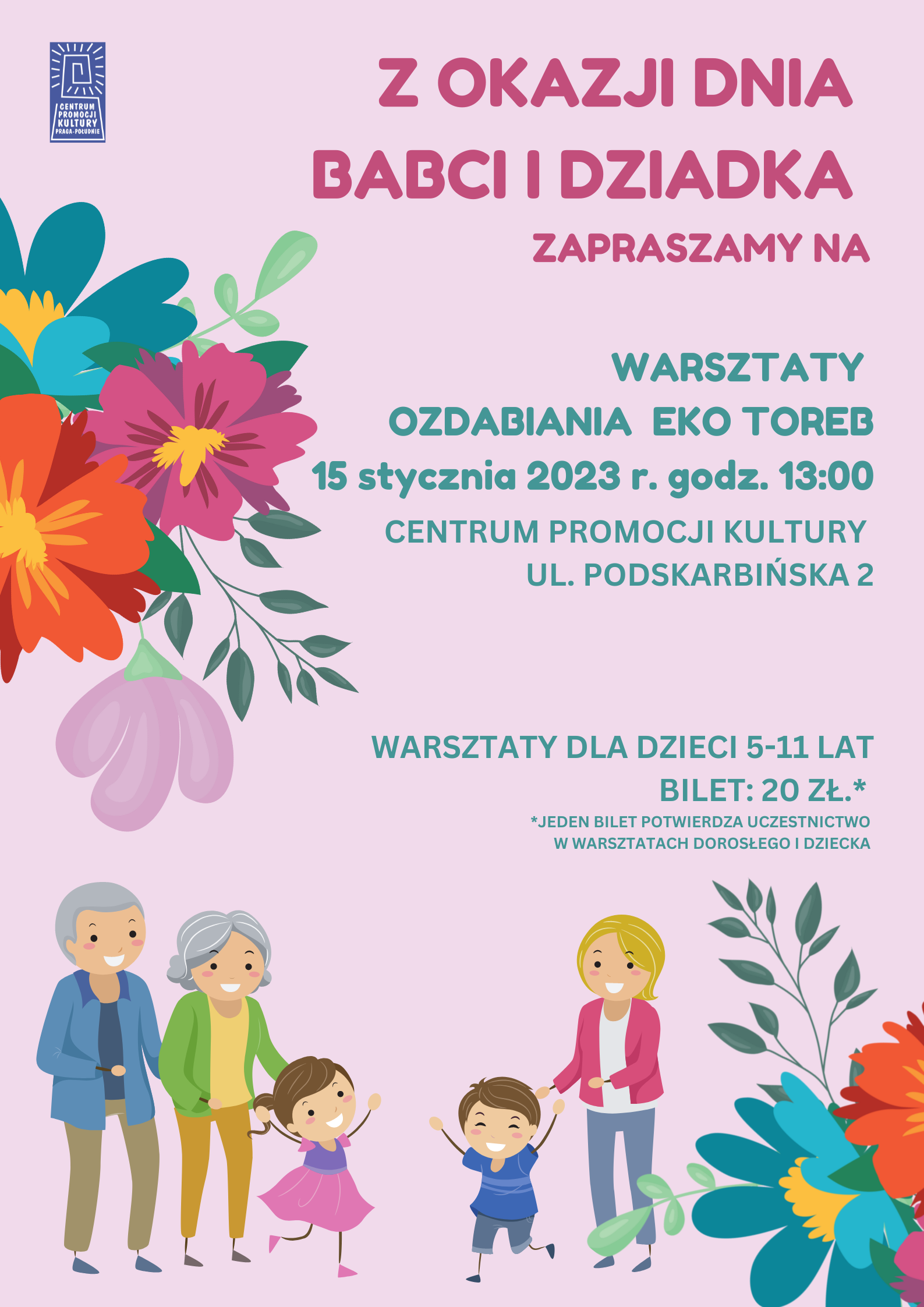 Z okazji Dni Babci i Dziadka zapraszamy do wspólnego i kreatywnego spędzenia czasu! Na zajęciach będziemy ozdabiać torby ekologiczne używając różnych technik plastycznych, dzięki czemu każdy znajdzie coś dla siebie. W szczególności zapraszamy babcie i dziadków z wnukami. Jeden bilet potwierdza uczestnictwo w warsztatach dorosłego i dziecka w wieku 5-11lat. Ilość miejsc ograniczona. Bilety: 20 zł.