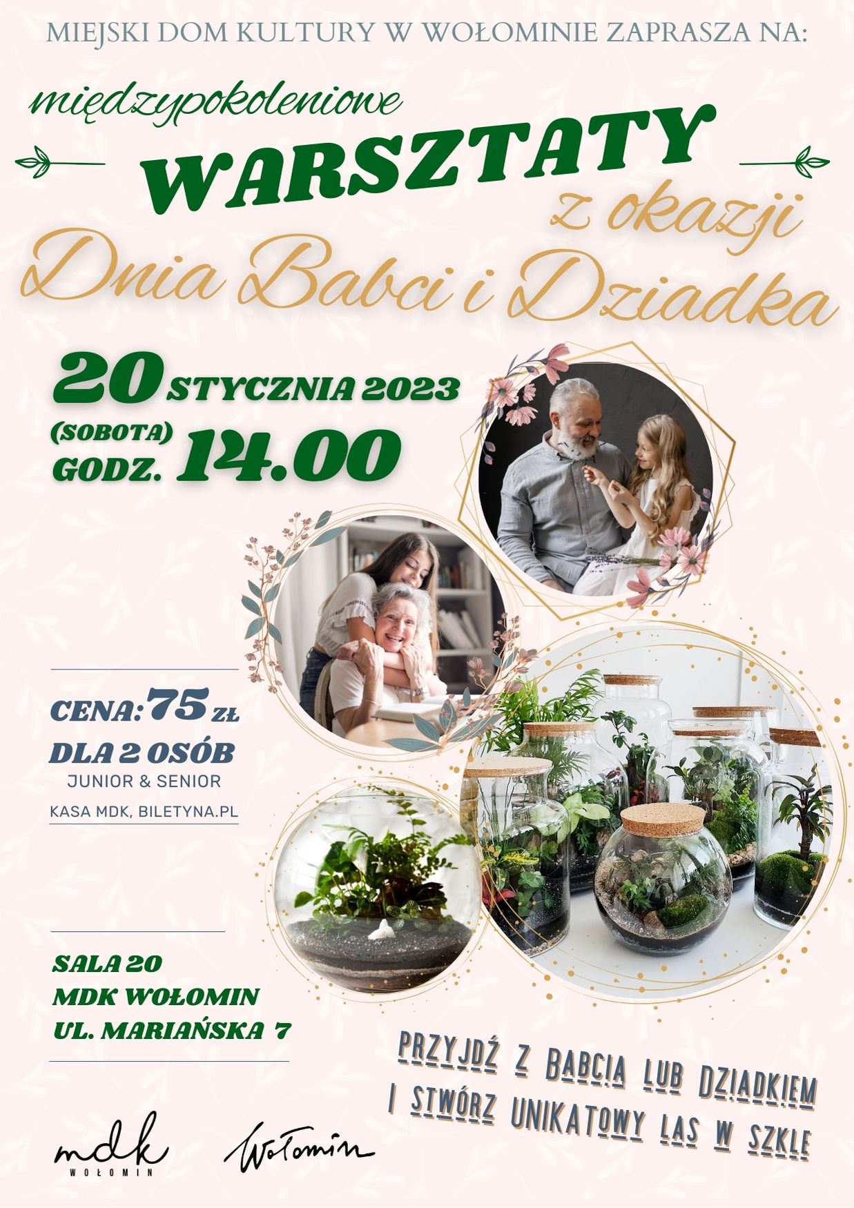 20 stycznia o godz. 14.00 zapraszamy serdecznie do MDK Wołomin na niezapomniane Warsztaty z okazji Dnia Babci i Dziadka, podczas których stworzymy razem magiczne lasy w szkle! Będzie to wyjątkowe wydarzenie pełne kreatywności, emocji i wspólnego spędzania czasu.