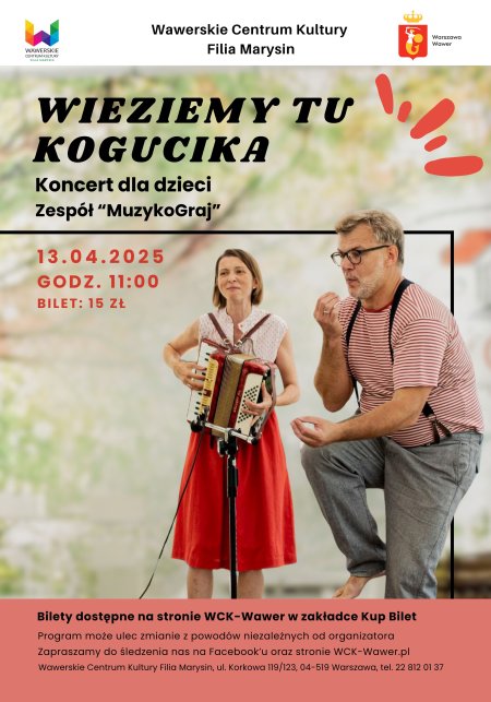 Zapraszamy na koncert oparty na tradycyjnych zabawach, tańcach i wyliczankach ludowych. Będziemy przeganiać zimę, czarować wiosnę, zatańczymy klepanego, zaśpiewamy dużo wiosennych piosenek: m. in. „Wieziemy tu kogucika”, „Do widzenia bałwanki”, „Przyszła wiosna do niedźwiedzia”, „Kle kle boćku kle kle”, „Zając”, „Baran”. Wartość starych ludowych zabaw dziecięcych jest ogromna. Większość z nich odwołuje się do natury, muzyka grana jest na żywo na pięknych tradycyjnych instrumentach ludowych takich jak skrzypce, akordeon, baraban. Pieśni które będziemy śpiewać mają też wymiar wspólnotowy. Dzieci bardzo dużo robią razem, ucząc się współdziałania w grupie.Koncert w wykonaniu zespołu MuzykoGraj.