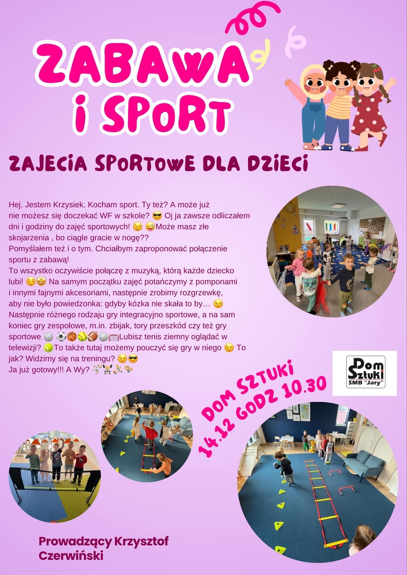 Zapraszamy dzieci w wieku 4-8lat do wspólnej zabawy na zajęciach sportowych.