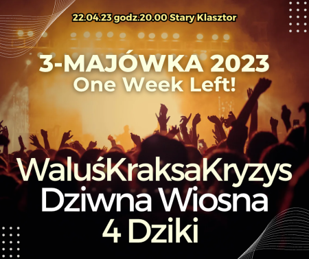 W sobotę 22 kwietnia, tydzień przed największym wrocławskim festiwalem 3-Majówka 2023, zapraszamy do Starego Klasztoru na wspólny koncert zespołów WaluśKraksaKryzys, Dziwna Wiosna i 4 Dziki. Te trzy, jak najbardziej " majówkowe" w swojej istocie zespoły, dadzą nam przedsmak tego co czeka nas od 30 kwietnia na 2 maja na terenach wrocławskiej Pergoli i Hali Stulecia.