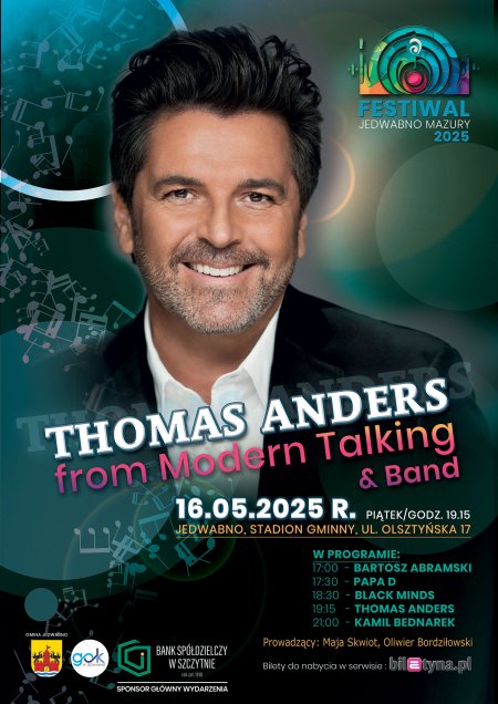 Festiwal muzyczny w Jedwabnie na Mazurach to wyjątkowe przedsięwzięcie, które łączy pasję do muzyki z pięknem natury. Będzie to jedno z największych w 2025 roku wydarzeń muzycznych w powiecie szczycieńskim. Koncert pełen gwiazd to spektakularne wydarzenie, podczas którego wystąpią: Thomas Anders from Modern Talking & Band, Kamil Bednarek, Papa D na czele z wokalistą Pawłem Stasiakiem oraz lokalni artyści Bartosz Abramski i grupa Black Minds.