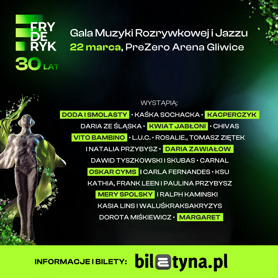 Doda, Smolasty, Kwiat Jabłoni, Daria Zawiałow🔥Fryderyk Festiwal 2024 - 30. jubileuszowa Gala Muzyki Rozrywkowej i Jazzu 👉 bilety już w sprzedaży! Największe święto polskiej muzyki odbędzie się 22 marca w PreZero Arenie Gliwice i tradycyjnie będzie otwarte dla publiczności💥Choć nominację do najważniejszych nagród muzycznych ogłoszone będą za kilka tygodni, już teraz znamy pierwsze nazwiska wykonawców: Doda, Smolasty, Kwiat Jabłoni, Daria Zawiałow🔥 A to dopiero początek! Nie może Was zabraknąć!👉🎫