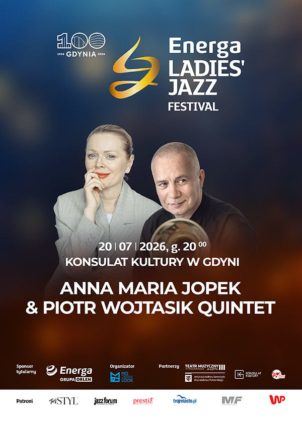 W 1995 roku nagrodził ją sam Michel Legrand i od tego czasu jest z nami i dla nas – obdarowuje nas fantastycznymi płytami i cudownymi koncertami, a my odwzajemniamy się niesłabnącą miłością i zachwytem, ubierając te płyty w platynę i złoto. Ubóstwiamy bywać na jej koncertach i chłonąć coraz to nowe projekty z coraz to innymi wspaniałymi artystami u boku. Stylistyczne ramy działalności Anny Marii Jopek tworzą trzy obszary muzycznych doświadczeń: wyniesione z domu zamiłowanie do folkloru, klasyczne wykształcenie muzyczne (absolwentka klasy fortepianu Uniwersytetu Muzycznego im. Fryderyka Chopina) oraz miłość do jazzu. Dzięki niej owo „contemporary eclectic jazz“ – jak mawiają niektórzy – jest dla nas frajdą, uniesieniem i gęsią skórką. Przynosi piękne, mądre słowa i melodie, pozwala obcować z jakością najwyższej próby i tęsknić za tym wszystkim do następnego razu. Artystce będzie towarzyszył znakomity Piotr Wojtasik na trąbce, Marcin Kaletka na saksofonie, Michał Tokaj przy fortepianie, Michał Barański na kontrabasie i Łukasz Żyta na perkusji. Jednym zdaniem: w poniedziałek, 20 lipca 2026 roku w przytulnym Konsulacie Kultury w stuletniej Gdyni oni będą tylko dla nas. Kto śmie twierdzić, że poniedziałki nie mogą być magiczne? Na Energa Ladies’ Jazz Festival bywają takie ze wszech miar.