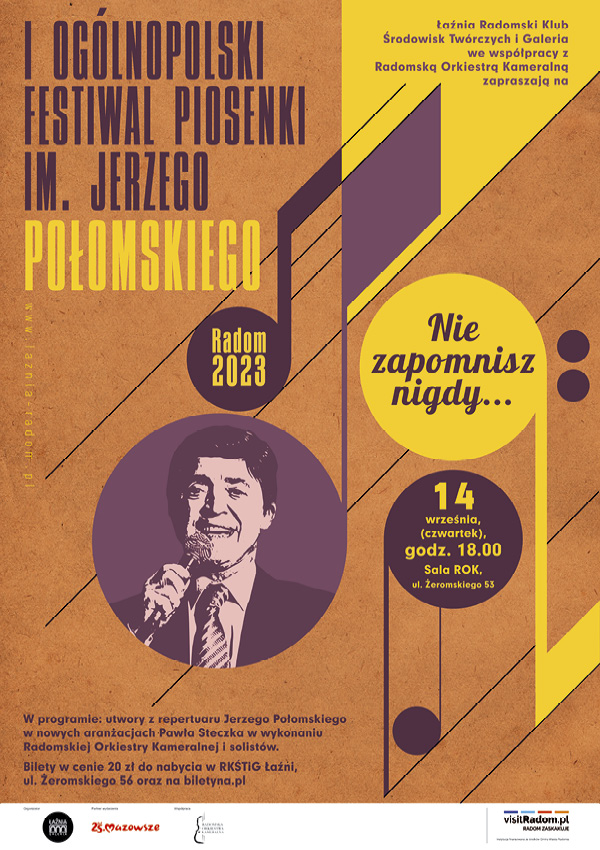 Ogólnopolski Festiwal Piosenki im. Jerzego Połomskiego „Nie zapomnisz nigdy…” Radom 2023 to koncert, który upamiętni znanego w całej Polsce artystę pochodzącego z Radomia. W tym roku przypada 90-ta rocznica urodzin oraz pierwsza rocznica odejścia Jerzego Połomskiego.