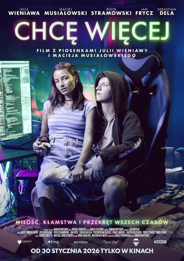 Młodzi ludzie i oszustwo, za które przyszło im zapłacić wysoką cenę. Inspirowany prawdziwymi wydarzeniami film, wciągający swoją intrygą i poruszający wyjątkowymi piosenkami, które zostaną z tobą na długo. W rolach głównych – ikona młodego pokolenia, głos i twarz generacji Z, znana z produkcji „Chłopi” i „Small World” – Julia Wieniawa oraz charyzmatyczny indywidualista polskiego kina, gwiazda hitu „Sala samobójców. Hejter” – Maciej Musiałowski. Na wielkim ekranie zobaczymy również: Jana Frycza („Ślepnąc od świateł”), Piotra Stramowskiego („Pitbull. Nowe porządki”), Jarosława Boberka („Underdog”), Sebastiana Delę („Pitbull”) i Pawła Monsiela („Policjanci i policjantki”). Reżyserem filmu jest Damian Matyasik, którego krótkometrażowy debiut „Mama umiera w sobotę” zdobył 36 nagród na międzynarodowych festiwalach (m.in. w Londynie, Amsterdamie, Paryżu, Dubaju, Tokio). Marcin wydaje się pewnym siebie facetem, jednak pod maską lidera kryje się zagubiony chłopiec, rozdarty między beztroskim podejściem do życia, a nieuchronną dorosłością. Zmuszony dramatyczną sytuacją podejmuje desperacką decyzję: wraz z dziewczyną Hanią i przyjaciółmi zanurza się w bezwzględny świat cyberprzestępczości. Już wkrótce ich działania zaczynają przynosić ogromne zyski. Jednak z czasem początkowy cel schodzi na drugi plan. Adrenalina, poczucie sprawczości i złudne wrażenie zwycięstwa stają się dla Marcina uzależnieniem - wciągają go w świat władzy i pieniędzy. Szukając uznania w oczach najbliższych, zapomina o tym, co najważniejsze. Miłość i lojalność zostaną wystawione na największą próbę.