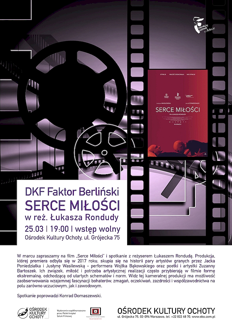 W marcu serdecznie zapraszamy na film „Serce Miłości” i spotkanie z reżyserem Łukaszem Rondudą. Produkcja, której premiera odbyła się w 2017 roku, skupia się na historii pary artystów granych przez Jacka Poniedziałka i Justynę Wasilewską - performera Wojtka Bąkowskiego oraz poetki i artystki Zuzanny Bartoszek. Ich związek, miłość i potrzeba artystycznej realizacji często przybierają w filmie formę ekstremalną, odchodzącą od utartych schematów i norm. Widz tej kameralnej produkcji ma możliwość zaobserwowania wzajemnej fascynacji bohaterów, zmagań, oczekiwań, zazdrości i współzawodnictwa na polu zarówno uczuciowym, jak i zawodowym.