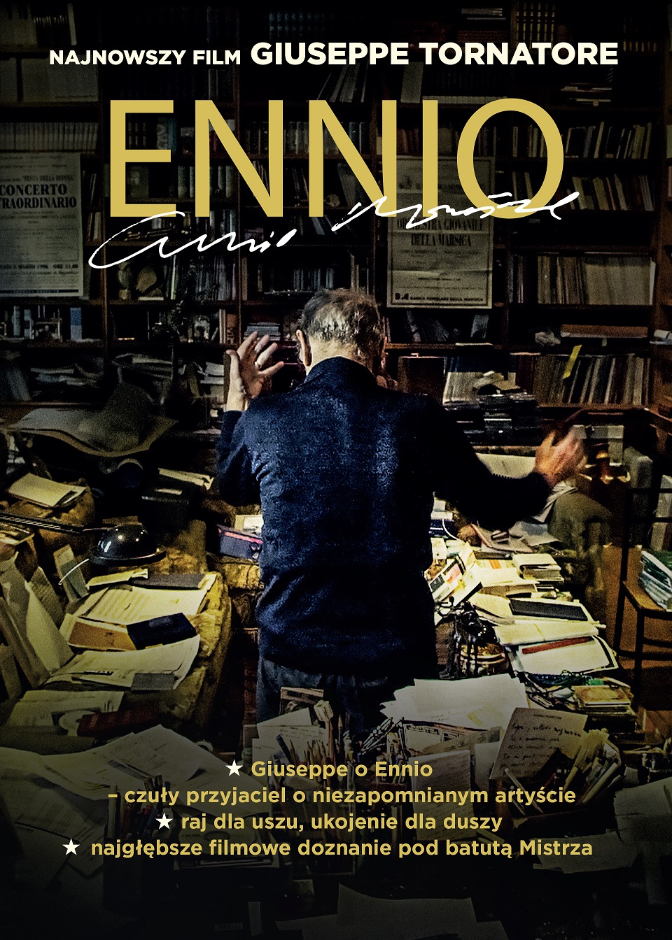 „Ennio” jest żywiołowym portretem geniusza, nakreślonym przez wiernego przyjaciela i znakomitego reżysera. Giuseppe Tornatore zaprasza nas w wyjątkowo osobistą podróż po prywatnym i artystycznym życiu wspaniałego kompozytora. Towarzyszą nam w niej wspominający go artyści i reżyserzy, tacy jak Bernardo Bertolucci, Clint Eastwood, Bruce Springsteen, Quentin Tarantino, John Williams czy Wong Kar Wai, ale przede wszystkim wtóruje nam niezapomniana filmowa muzyka Mistrza. W końcu, historia jego życia to historia kina.