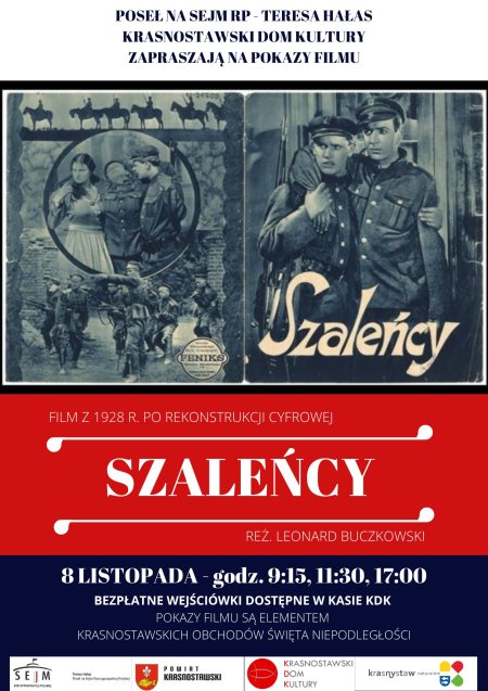 W Imieniu Honorowego Komitetu Krasnostawskich Obchodów 104. Rocznicy Odzyskania przez Polskę Niepodległości serdecznie zapraszamy na wydarzenie towarzyszące, które odbędzie się 8 listopada 2022 r. w Krasnostawskim Domu Kultury. Wydarzeniem tym będzie projekcja jednego z ostatnich polskich filmów niemych, którym jest dramat wojenny „Szaleńcy” w reżyserii Leonardo Buczkowskiego. Jest on pierwszą polska superprodukcją. W obrazie zastosowano nowatorskie jak na tamte czasy rozwiązania techniczne i efekty specjalne.