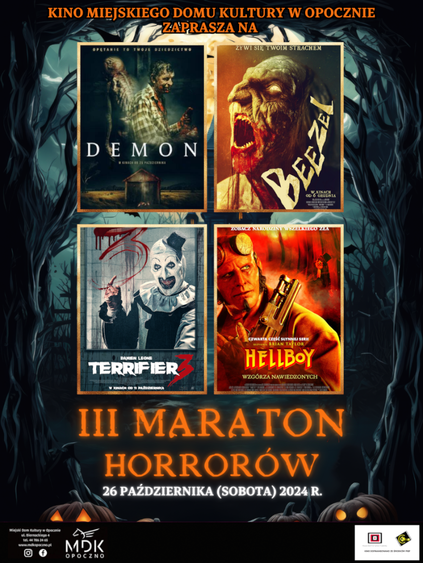 Kino Miejskiego Domu Kultury w Opocznie zaprasza na III MARATON HORRORÓW, który odbędzie się 26 października o godz.20:00. W repertuarze tegorocznego maratonu zagoszczą takie tytuły jak: Demon (premierowo), Terrifier 3 (popremierowo), Bezzel (przedpremierowo) oraz Hellboy: Wzgórza Nawiedzonych (przepremierowo).