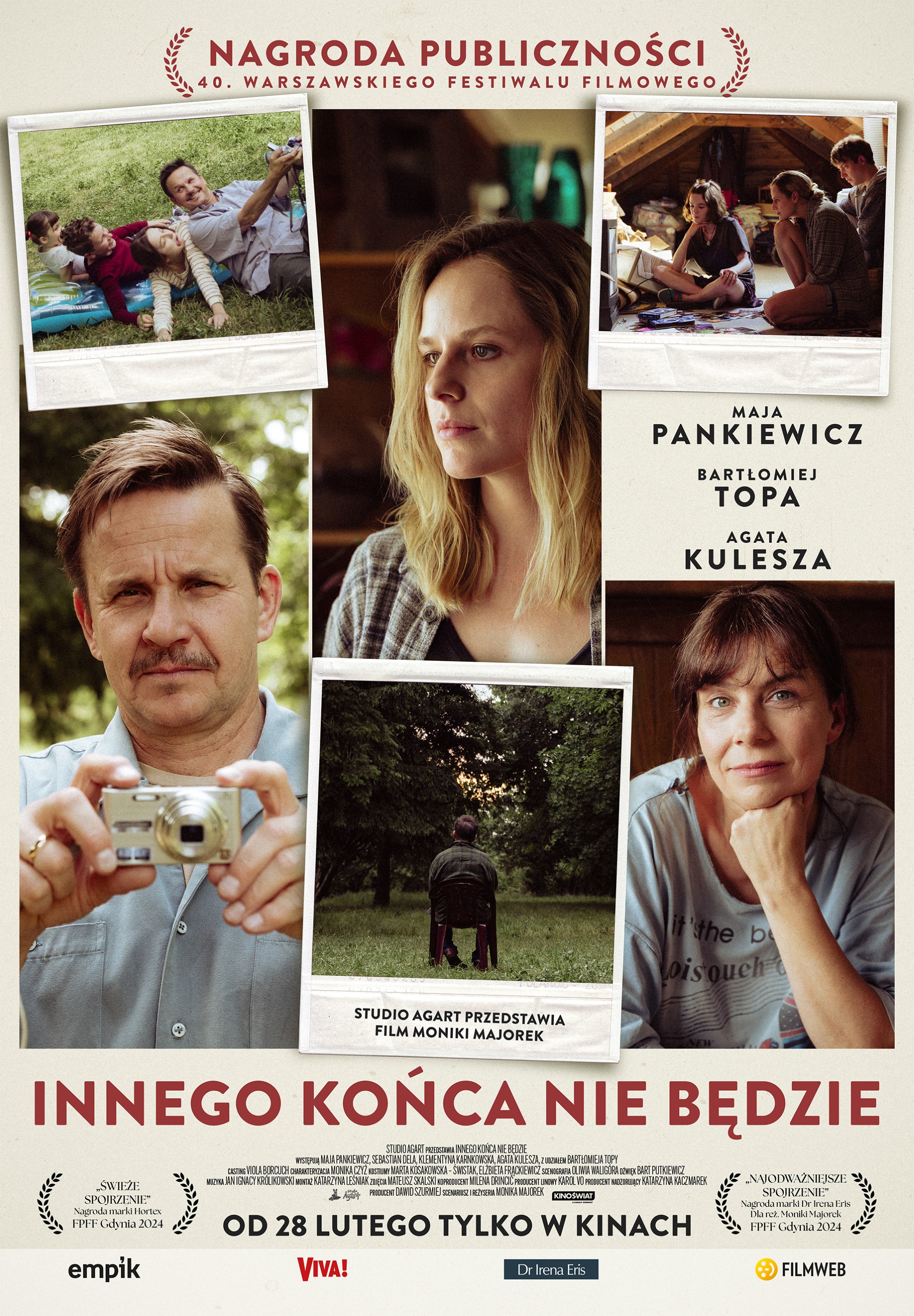 Zwycięzca plebiscytu publiczności w kategorii „film fabularny” 40. Warszawskiego Festiwalu Filmowego. Zobacz zwiastun filmu „Innego końca nie będzie”, pełnej szczerych emocji opowieści o nadziei na przyszłość, odbudowie rodzinnych relacji i sile wspomnień. Na ekranie zobaczymy gwiazdę serialu „Morderczynie” – Maję Pankiewicz, czterokrotną laureatkę Orłów – Agatę Kuleszę, docenionego przez widzów serialu „1670” Bartłomieja Topę, a także Sebastiana Delę („#BringBackAlice”), Cezarego Łukaszewicza („Chłopi”) i Klementynę Karnkowską („Wyrwa”). Po dłuższej nieobecności, Ola, najstarsza z trójki rodzeństwa, postanawia wrócić w rodzinne strony. Chociaż na pierwszy rzut oka wszystko wygląda znajomo, to w rzeczywistości życie jej bliskich ruszyło dalej. Mama ma nowego partnera, w garażu brakuje ulubionego samochodu taty, a rodzinny dom wkrótce ma zostać sprzedany. Relacje z bratem, siostrą i matką są dalekie od ideału. Ola wie, że to ostatni moment, aby pogodzić się z przeszłością i zacząć żyć na nowo. Pomogą w tym pełne ciepłych wspomnień rodzinne kasety video i zdjęcia znalezione na strychu.