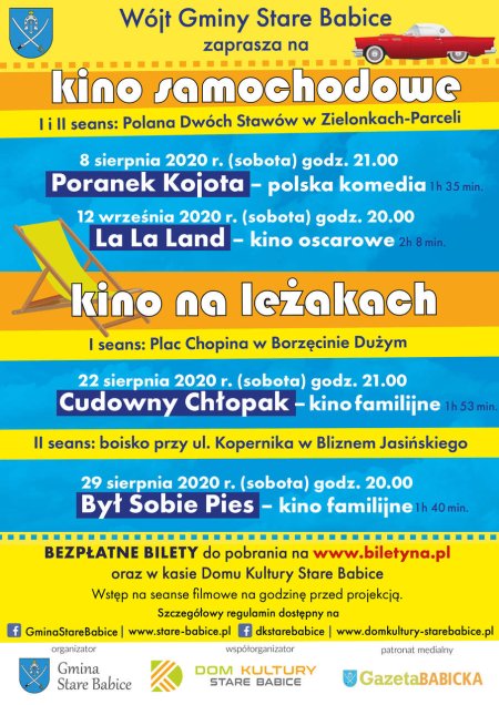 Zapraszamy na plenerowe kino na leżakach w dniu 29 sierpnia br. o godz. 20.00 na film obyczajowy „Był Sobie Pies”. Projekcja odbędzie się na boisku w Bliznem Jasińskiego przy ul. Kopernika. Wejście na teren kina tylko za okazaniem bezpłatnego biletu, który należy pobrać z portalu biletyna.pl lub w kasie Domu Kultury Stare Babice.