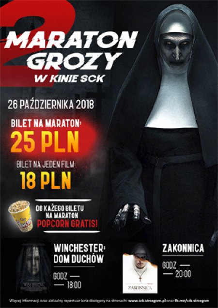 Zapraszamy na kojejny koszmarny wieczów w Strzegomskim Centrum Kultury z cyklu Maraton Grozy. To już druga odsłona naszego eventu. Podczas tegorocznej edycji będzie można obejrzeć Filmy pt. "Winchester: Dom Duchów" oraz "Zakonnica".