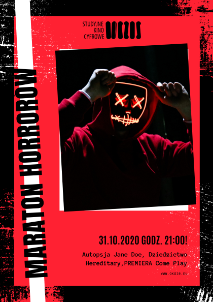 Nocny Maraton Horrorów. Jak co roku z okazji Halloween przygotowaliśmy prawdziwą ucztę dla wszystkich fanów mocnych wrażeń! Pokażemy trzy filmy, których jedynym celem jest… śmiertelnie Was wystraszyć! Na początek, upiorna, intrygująca opowieść Autopsja Jane Doe. Następnie przerażający i trzymający w napięciu do granic możliwości film Dziedzictwo Hereditary, a po nim klimatyczny i straszliwy do tego premierowy film Come Play.