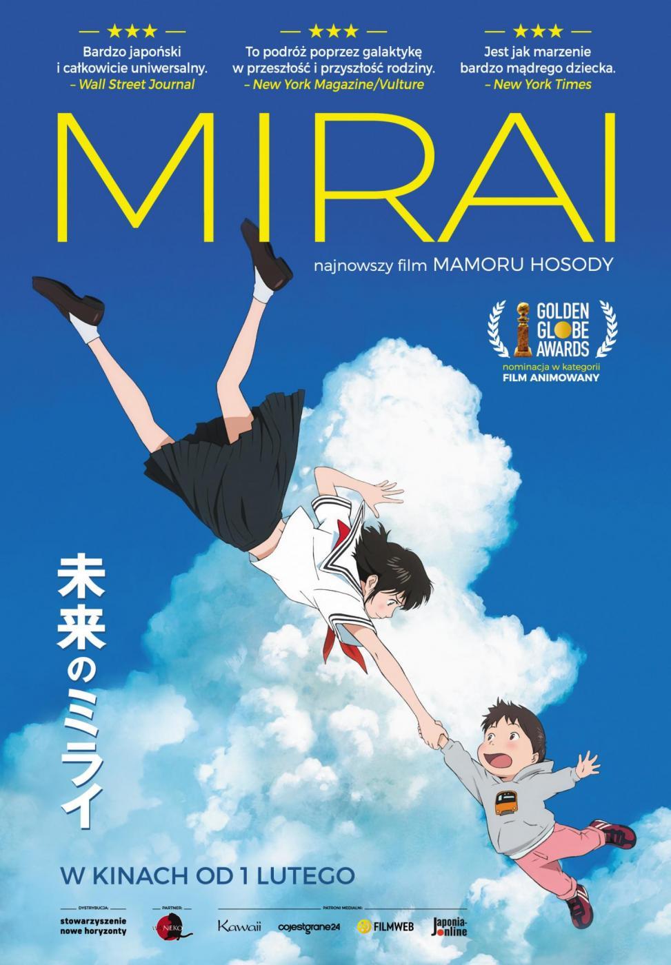 „Mirai” to najnowsza animacja jednego z najważniejszych współczesnych twórców tego gatunku, Mamoru Hosody, reżysera m.in. „Wilczych dzieci”, a zarazem pierwszy japoński film anime, który miał swoją premierę na Międzynarodowym Festiwalu Filmowym w Cannes. Reżyser opowiada dziecięcy świat zazdrości i poczucia niesprawiedliwości, a także złości i buntu wobec dorosłych, którzy zapomnieli już, że świat z perspektywy dziecka wygląda zupełnie inaczej. Klasyczna animacja ze współczesną japońską rodziną w tle.