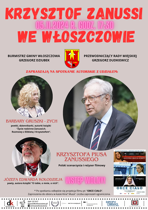 We wtorek, 5 listopada 2024 r., zapraszamy do Domu Kultury we Włoszczowie na spotkanie autorskie z wybitnym reżyserem prof. Krzysztofem Zanussim oraz Barbarą Gruszką-Zych, poetką, dziennikarką, autorką książek: Życie rodzinne Zanussich. W spotkaniu weźmie udział Józef Edward Kołodziej. Rozmowy z Elżbietą i Krzysztofem i Moi ważni. Portrety prywatne. Spotkanie rozpocznie się o godz. 17:30.