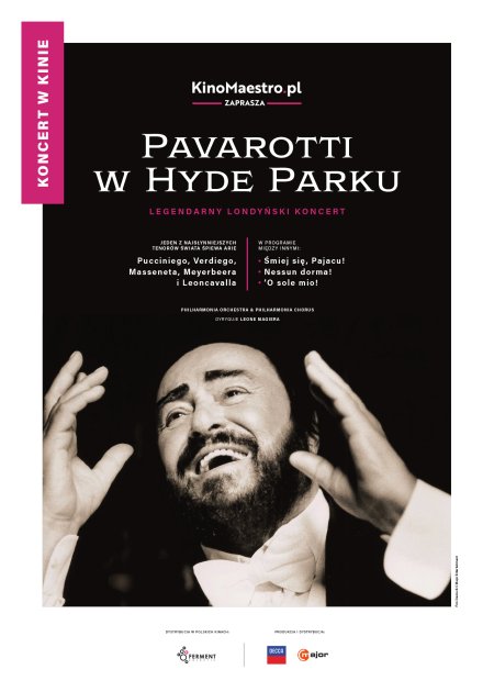 Któż nie chciałby obejrzeć największego tenora XX wieku na wielkim ekranie? Dlatego przypominamy kultowy koncert Luciana Pavarottiego w Hyde Parku. Był rok 1991, włoski śpiewak miał wtedy 55 lat i znajdował się u szczytu swojej operowej kariery. Choć w dniu koncertu strasznie padało, ponad 125.000 melomanów przyszło do słynnego londyńskiego parku, by posłuchać swojego ulubionego tenora. Wśród gości znaleźli się m.in. Diana, księżna Walii, Karol, jej mąż i następca tronu (obecnie król Karol III), premier Wielkiej Brytanii John Major, kompozytor Andrew Lloyd Weber oraz aktor Michael Caine. Występujący od mediolańskiej La Scali po nowojorską The Metropolitan Opera Luciano Pavarotti zaśpiewał wtedy przemoczonej, ale szczęśliwej publiczności arie, które szczególnie lubił, ze słynną Nessun dorma! z opery Turandot Pucciniego na czele. Nie zabrakło też pieśni Di Capuy ’O sole mio! W programie koncertu znalazły się również kompozycje Verdiego, Masseneta, Wagnera, Meyerbeera i Leoncavalla (słynna aria Śmiej się, pajacu!). Artyście towarzyszyła 80-osobowa orkiestra i 120-osobowy chór.