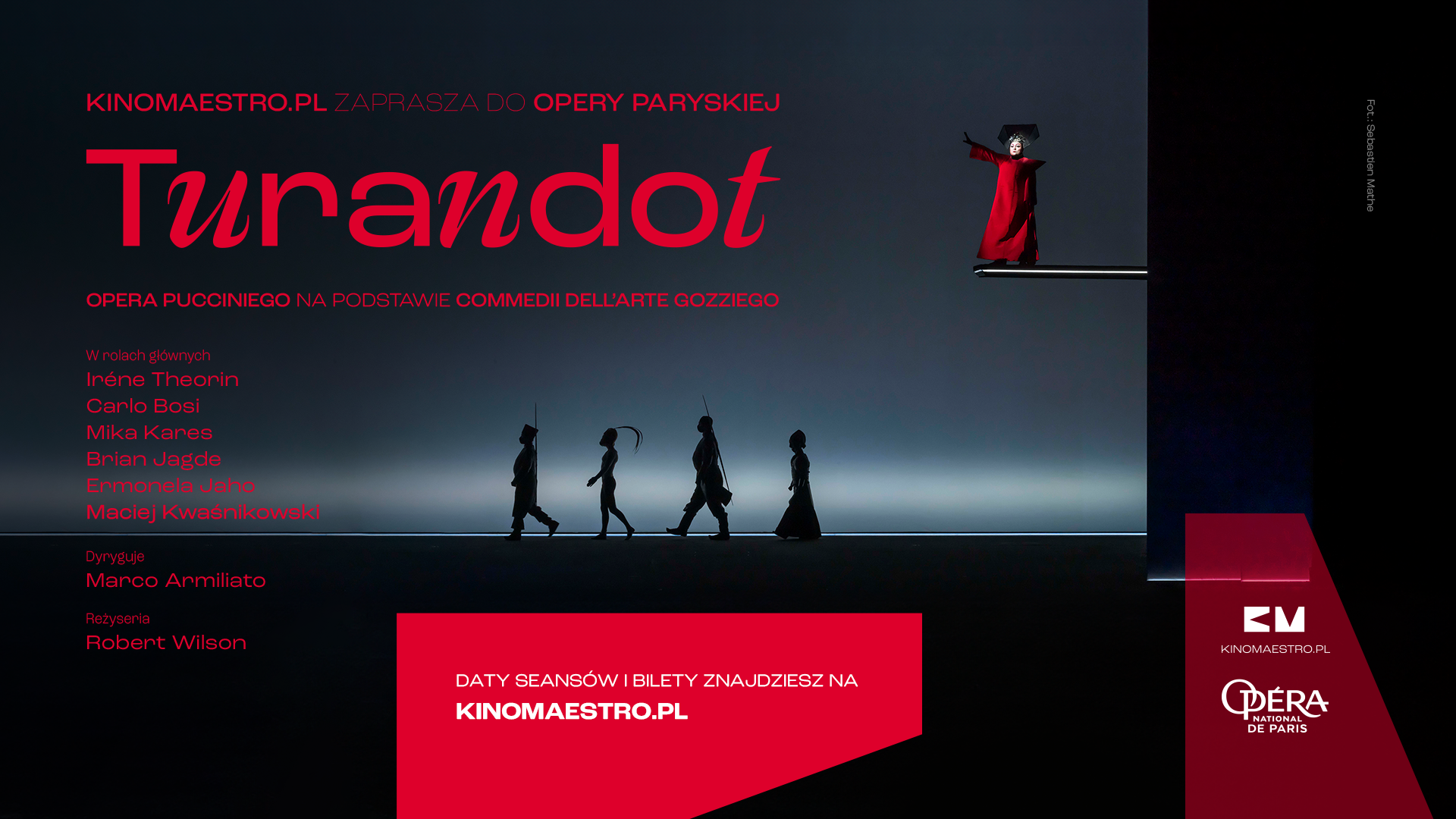 Przedstawienia Wilsona to wysmakowane estetycznie obrazy, precyzyjny ruch postaci i niesamowite efekty świetlne. Dlatego też najważniejsze teatry operowe powierzały mu i nadal powierzają do realizacji najznamienitsze tytuły: Madame Butterfly Pucciniego, Makbeta, Otella i La traviatę Verdiego, Fausta Gounoda czy Peleasa i Melizandę Debussy’ego. Spektakl Turandot, który obejrzymy, był transmitowany do kin na całym świecie w listopadzie 2023 roku. Zadyrygował nim Marco Armiliato, Włoch współpracujący z najważniejszymi teatrami operowymi świata. W międzynarodowej obsadzie śpiewaków (Iréne Theorin jako księżniczka Turandot, Brian Jagde jako książę Kalaf i Ermonela Jaho w roli niewolnicy Liu) znalazł się stale współpracujący z Paryską Operą Narodową tenor Maciej Kwaśnikowski. Ostatnio podziwialiśmy go jako Tybalta w retransmisji Romea i Julii Gounoda. Teraz będzie Pangiem, jednym z trzech ministrów bezwzględnej chińskiej księżniczki Turandot, która ucina głowy pretendentom do jej ręki…
