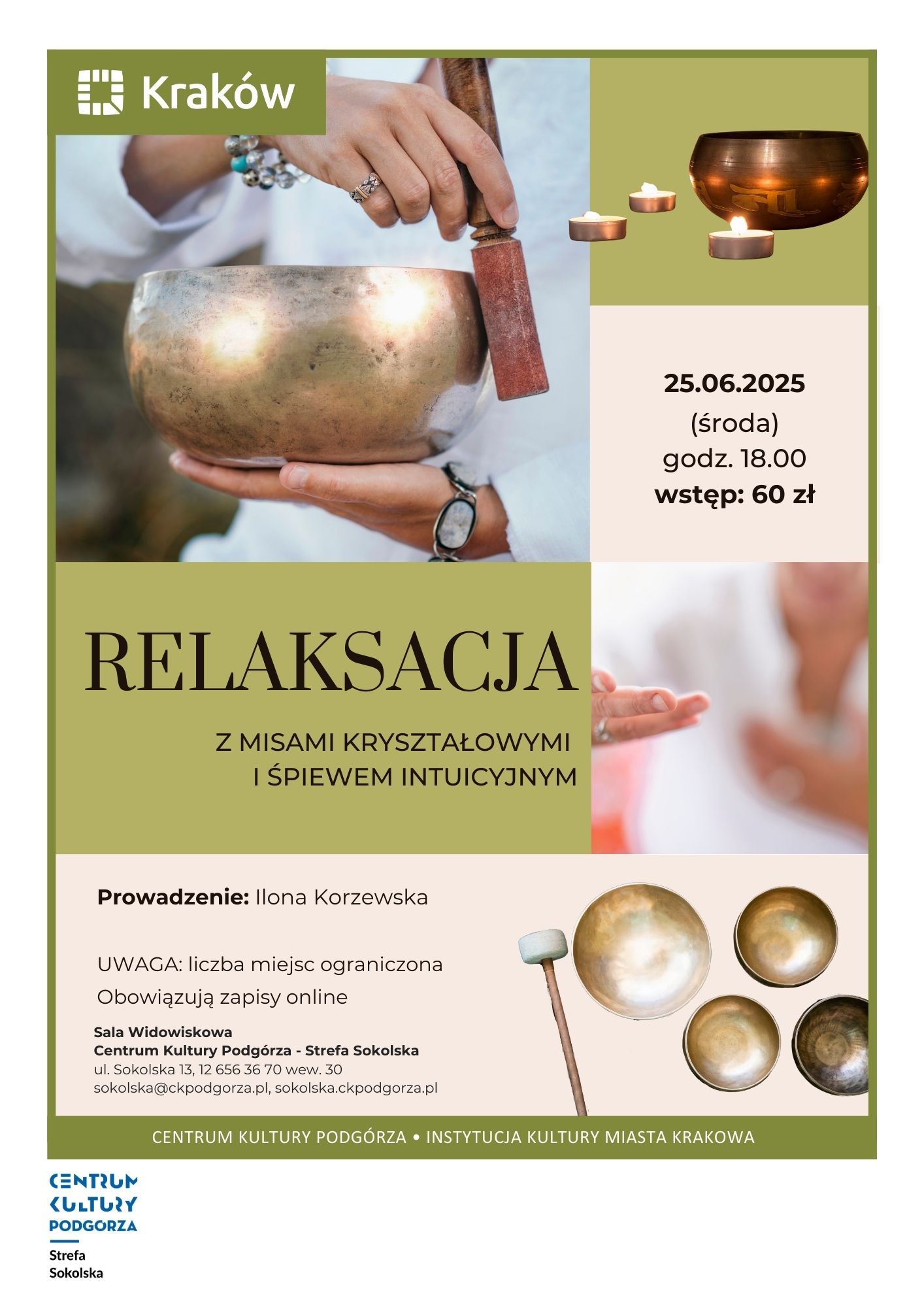 Prowadząca, Ilona Korzewska, łączy swoje doświadczenie artystyczne z wiedzą z zakresu muzykoterapii, tworząc bezpieczną przestrzeń do głębokiej relaksacji i wewnętrznej harmonii. Po zakończeniu sesji jest czas na powrót do rzeczywistości i podzielenie się swoimi odczuciami. To wyjątkowa okazja, by zanurzyć się w uzdrawiających dźwiękach i odnaleźć spokój w sobie.