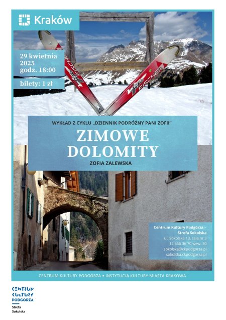 29.04. Wykład z cyklu „Dziennik podróżny Pani Zofii”: Zimowe Dolomity /wtorek, godz. 18.00