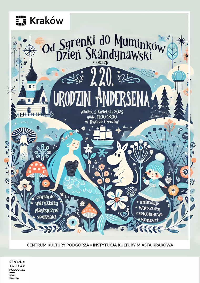 Zapraszamy na Dzień Skandynawski w Dworze Czeczów z okazji 220. urodzin Andersena "Od Syrenki do Muminków", który odbędzie się w sobotę 5 kwietnia 2025 r. w godz. 11.00-18.00.
