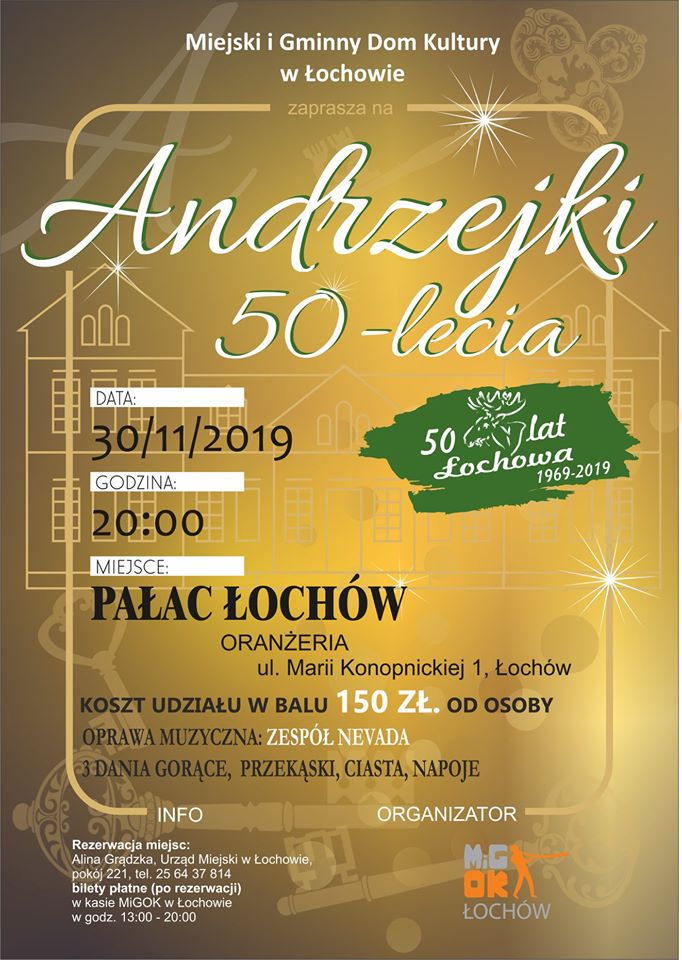 BILETY - KASA MIGOK - płatność tylko gotówką. Miejski i Gminny Ośrodek Kultury w Łochowie zaprasza na Andrzejki 50-lecia. 30 listopada 2019r., miejsce Pałac Łochów - Oranżeria. Godzina 20:00. Koszt udziału w balu 150zł od osoby. Oprawa muzyczna Zespół Nevada. 3 dania gorące, przekąski, ciasta, napoje.