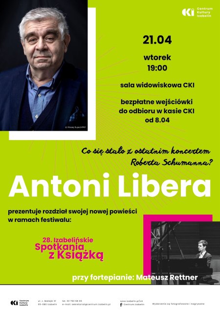 Rozpoczynamy go wyjątkowym spotkaniem literackim. 21 kwietnia na scenie Centrum Kultury Izabelin będziemy gościć Antoniego Liberę – znakomitego polskiego pisarza, tłumacza i reżysera teatralnego, autora m.in. bestsellerowej powieści „Madame”, która została przetłumaczona na 25 języków i odniosła sukces w ramach IMPAC Dublin Literary Award w 2002 r.