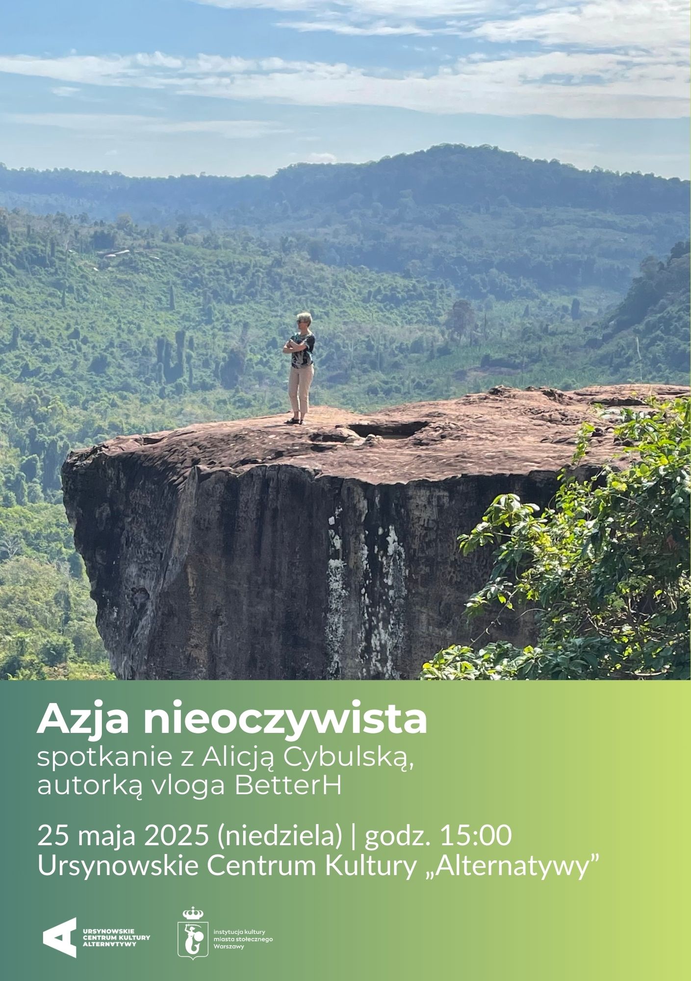 Alicja Cybulska – podróżniczka i autorka vloga BetterH (Better Half of Life) – przez ostatnie trzy lata mieszkała w Singapurze i samotnie przemierzała Azję. Podczas spotkania opowie, jak życie na tym kontynencie wpłynęło na jej sposób postrzegania świata. Podzieli się najważniejszymi lekcjami, które tam odebrała, oraz przywoła momenty pełne zaskoczenia, wzruszeń i zachwytu. Razem zanurzymy się w kulturze Singapuru, Wietnamu, Japonii i Kambodży. Dodatkowo Alicja przeczyta pierwszy rozdział swojej książki, której premiera zaplanowana jest na grudzień 2025 roku. Autorka profilu BetterH na Facebooku, Instagramie i serwisie YouTube pracowała jako strateg w międzynarodowej korporacji w Singapurze. Obecnie realizuje swój plan na Better Half of Life – pełen wolności, słońca i kreatywności.