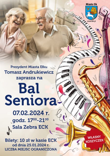 "Prezydent Miasta Ełku zaprasza na BAL SENIORA, który odbędzie się dnia 07 lutego 2024 r. (środa) w Ełckim Centrum Kultury na Sali Zebra w godzinach 17.00 – 21.00. Będzie to doskonała okazja do spędzenia aktywnie czasu wolnego, wspólnej zabawy oraz tańców. Nie zabraknie też dobrej muzyki, która uatrakcyjni ten wspólnie spędzony czas.