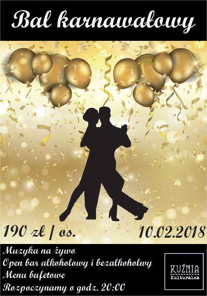 Serdecznie zapraszamy do Kuźni Kulturalnej na wyjątkowy bal karnawałowy. Zapewniamy doskonałą kuchnię, wspaniałą muzykę na żywo oraz świetną zabawę. A wszystko to dopełnione niepowtarzalnym klimatem Kuźni Kulturalnej.