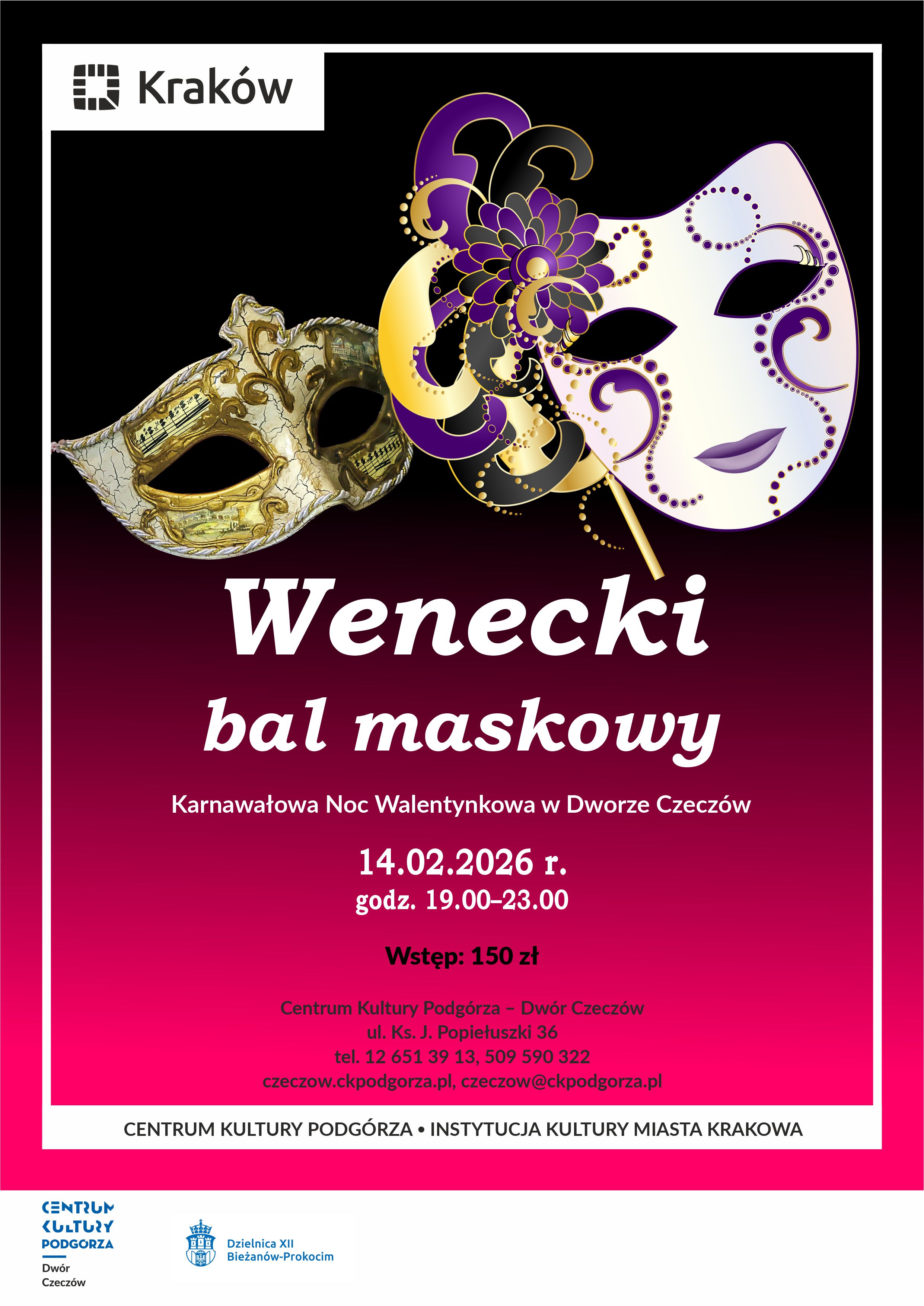 Zapraszamy na "Wenecki Bal Maskowy – Karnawałową Noc Walentynkową w Dworze Czeczów", która odbędzie się w sobotę 14 lutego 2026 r. o godz. 19.00.