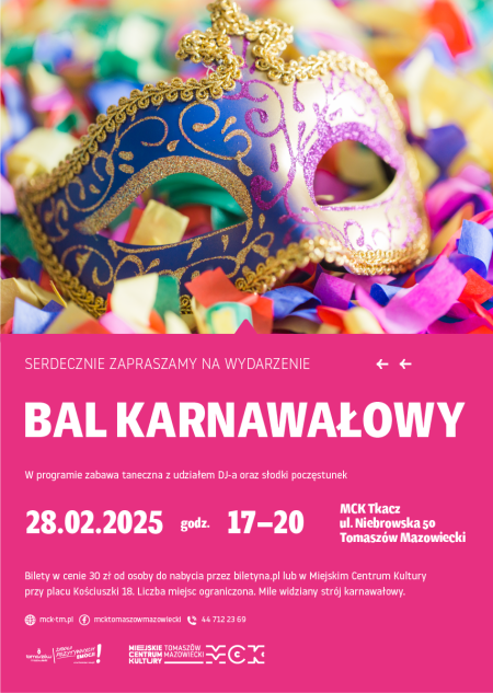 Zapraszamy na Bal Karnawałowy, ktory odbędzie się 28 lutego w godzinach 17-20, zabawa przy muzyce DJ Łukasza Michalczyka. Mile widziany strój karnawałowy. Zapewniamy słodki poczęstunek . Bilet w cenie 30zł. Ilość miejsc ograniczona.