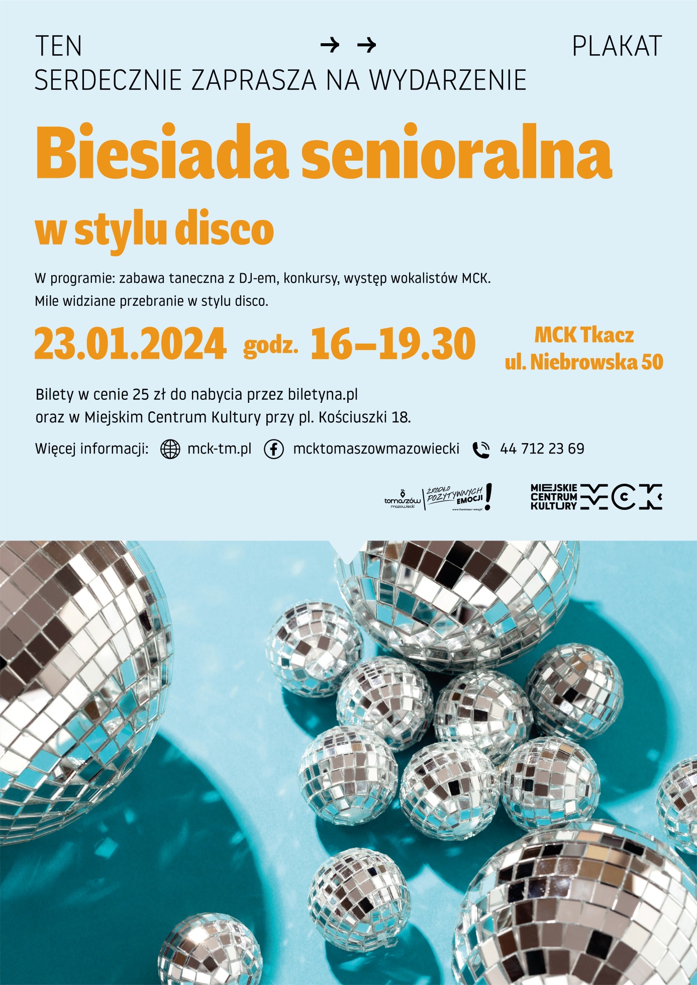 Biesiada senioralna w stylu disco. Zapraszamy 23 stycznia 2024 roku w godzinach 16.00-19.30 do MCK Tkacz ul. Niebrowska 50. Liczba miejsc ograniczona. W programie: zabawy i konkursy, występy wokalistów MCK, tańce przy muzyce Dj Marka. Mile widziane prebranie: cekiny błysk.