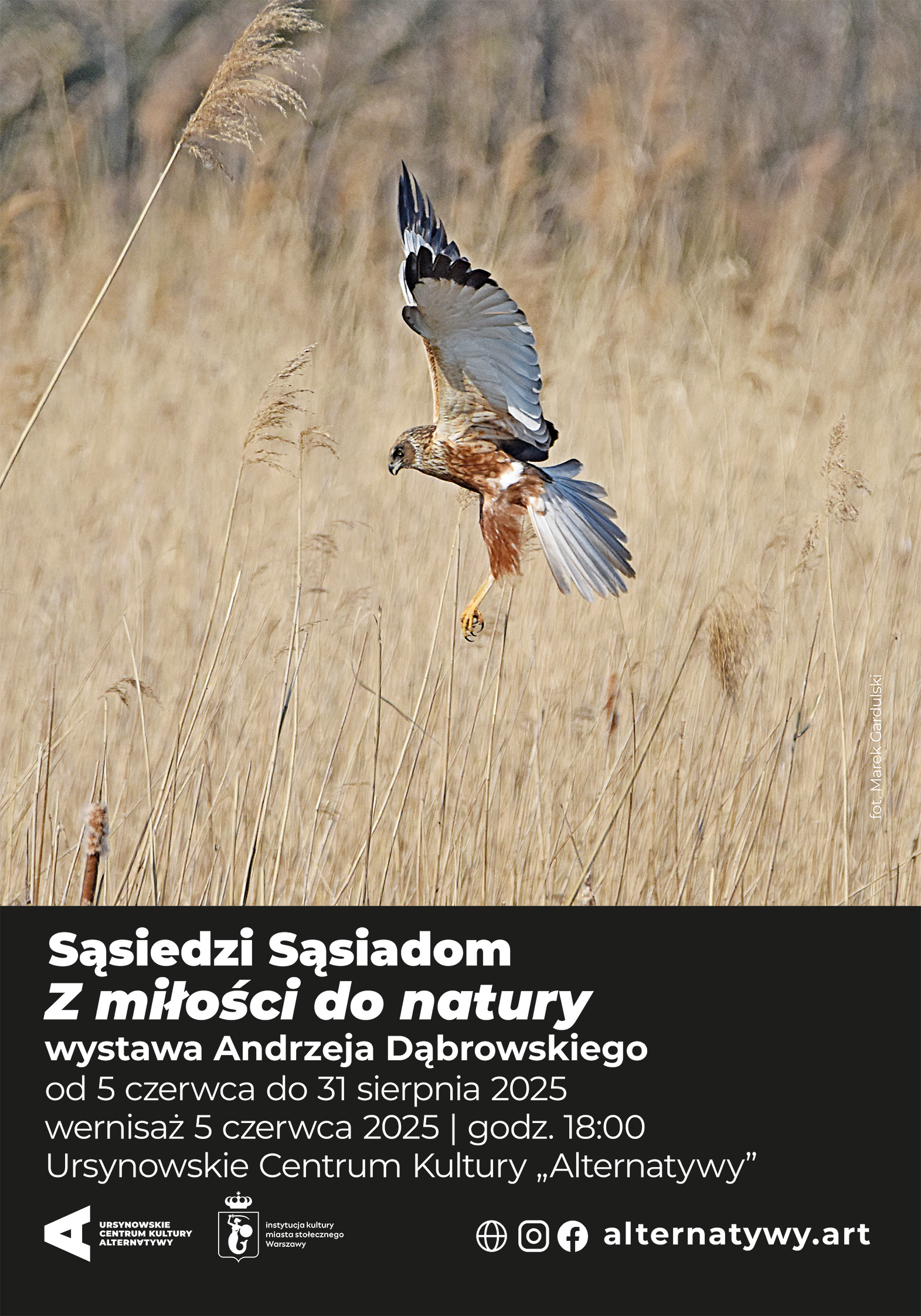 Andrzej Dąbrowski – od czterech dekad mieszkaniec Ursynowa – przez wiele lat z pasją oddawał się pracy stolarza, tworząc zarówno wyroby użytkowe, jak i autorskie projekty o wyjątkowym charakterze. Po przejściu na emeryturę odnalazł nową drogę artystycznego wyrazu – fotografię. Szczególne miejsce w jego sercu zajmuje przyroda, a zwłaszcza ptaki – wolne, dzikie, nieprzewidywalne. Z aparatem w dłoni przemierza Polskę, nieraz spędzając długie godziny w ciszy i skupieniu, by uchwycić idealny moment – niepowtarzalne spojrzenie, rozpostarte skrzydła, światło zatrzymane na piórach. Dziś jego archiwum liczy dziesiątki tysięcy zdjęć. Na tę wystawę wybrał te, które są mu szczególnie bliskie – fotografie niosące osobistą historię, pełne cierpliwości i zachwytu nad światem, który często umyka naszej codziennej uwadze. To zaproszenie do zatrzymania się – i spojrzenia na naturę oczami człowieka, który potrafi się nią naprawdę zachwycić.