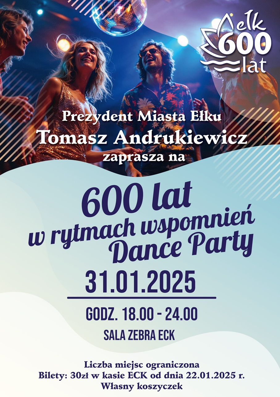 Prezydent Miasta Ełku zaprasza na DANCE PARTY, które odbędą się dnia 31 STYCZNIA 2025 r. (piątek) w Ełckim Centrum Kultury na Sali Zebra w godzinach 18.00 – 24.00.