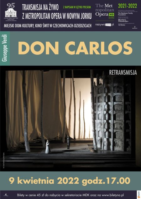 Pod batutą dyrektora muzycznego Met Yannicka Nézeta-Séguina z osadzoną w czasach hiszpańskiej inkwizycji opowieścią o skazanej na zagładę miłości zmierzą się: tenor Matthew Polenzani w roli tytułowej, bas Eric Owens jako król Hiszpanii Filip II, sopranistka Sonya Yoncheva jako jego żona Elżbieta de Valois, mezzosopranistka Elīna Garanča jako księżniczka Eboli, baryton Étienne Dupuis jako Rodrigo. W roli Wielkiego Inkwizytora wystąpi zaś bas-baryton John Relyea. Reżyseruje Sir David McVicar, który współpracuje z Met już po raz jedenasty, co plasuje go w czołówce najbardziej popularnych i płodnych twórczo reżyserów w najnowszej historii nowojorskiej opery.
