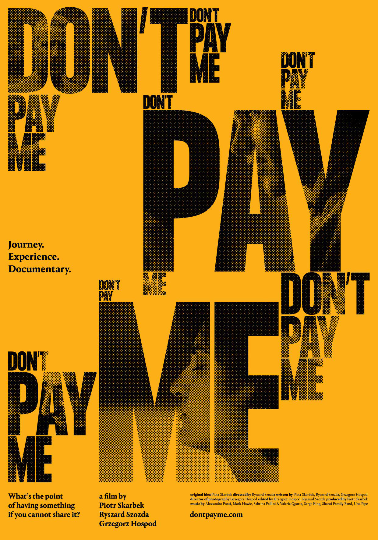 Zapraszamy na premierę wyjątkowego filmu dokumentalnego. Don’t Pay Me to portret ludzi prowadzących alternatywny styl życia w Europie. Ich cechą wspólną jest aktywna negacja konwencjonalnego priorytetu gromadzenia pieniędzy i dóbr. Zamiast tego wolą dzielić się swoją wiedzą, domem, jedzeniem, umiejętnościami i czasem. Chociaż za swoją pracę nie dostają ani grosza, i tak towarzyszy im poczucie prowadzenia szczęśliwego, luksusowego życia.