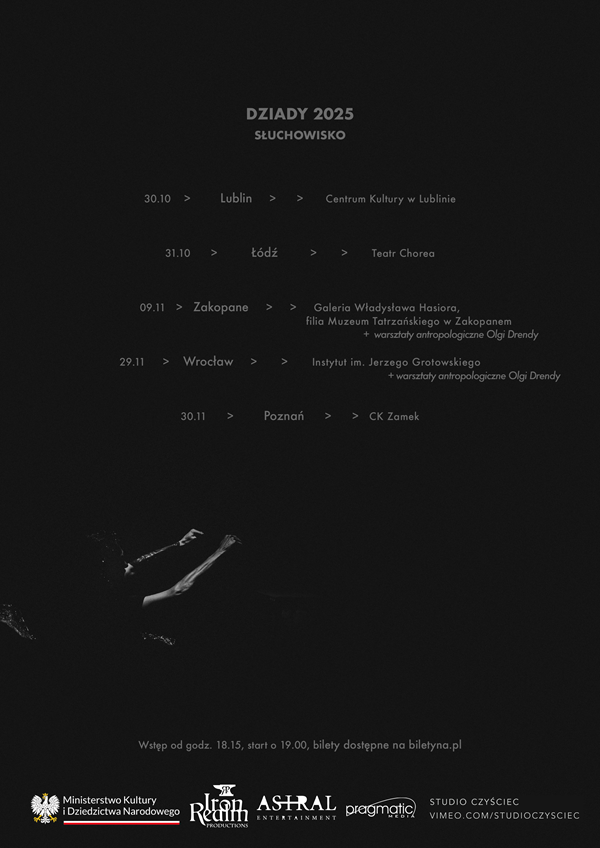 Tej jesieni „𝗗𝘇𝗶𝗮𝗱𝘆” nawiedzą pięć miast w Polsce: Lublin (30.10, Centrum Kultury w Lublinie), Łódź (31.10, Teatr Chorea), Zakopane (9.11, Galeria Władysława Hasiora, Fila Tatrzańskiego w Zakopanem), Wrocław (29.11, Instytut Imienia Jerzego Grotowskiego) i Poznań (30.11, CK Zamek).