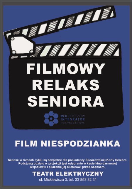 Darmowe wejścióki za okazaniem Skoczowskiej Karty Seniora dostępne w kasie kina godzinę przed każdym seansem/wydarzeniem - szczegółowa informacja o filmie w siedzibach MCK „Integrator”. Organizator: MCK „Integrator”.