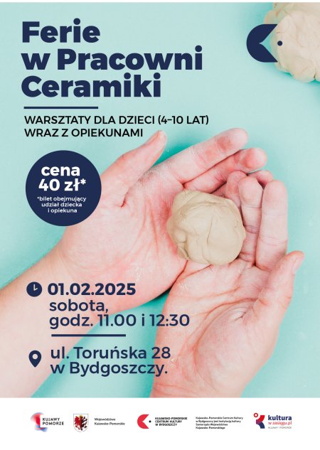 Powrót do szkoły po feriach już na horyzoncie? tym bardziej wykorzystaj ostatni weekend przerwy aktywnie – na kreatywnej zabawie z gliną! Pracownia Ceramiki Kujawsko-Pomorskiego Centrum Kultury zaprasza dzieci w wieku 4–10 lat wraz z opiekunami! Glina to materiał bardzo plastyczny i przyjazny, a po wypaleniu trwały. Na zajęciach poznasz techniki formowania prostych form użytkowych. Wypalone prace są malowane i zabierane do domu. Na zajęciach powstają figurki, płaskorzeźby, a także formy użytkowe jak kubki, doniczki czy wazony. Czas trwania zajęć: 1 godzina zegarowa. Koszt jednorazowy zajęć (obejmujący udział dziecka i opiekuna) to 40 zł. Bilety do nabycia wyłącznie przez internet – na platformie biletyna.pl Uwaga! Warsztaty odbywają się w budynku przy ul. Toruńskiej 28 w Bydgoszczy.