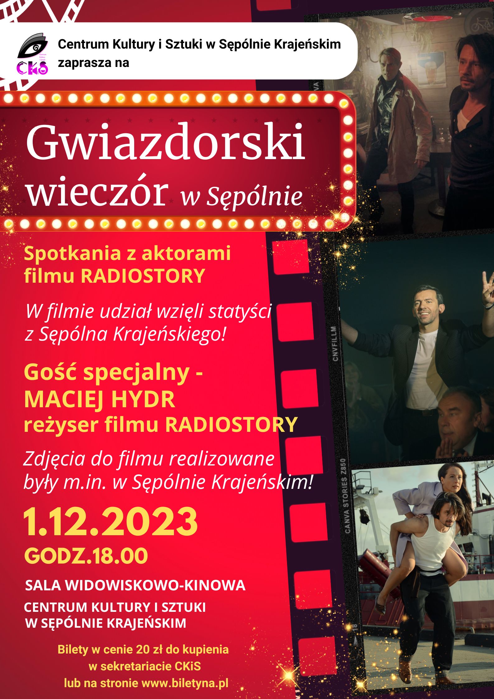 Zapraszamy Państwa na Gwiazdorski wieczór do Centrum Kultury i Sztuki w Sępólnie Krajeńskim, gdzie w doborowym towarzystwie aktorów i reżysera filmu Radiostory, poczujemy niezwykłą filmową atmosferę. Podczas spotkania wspólnie odkryjemy kulisy produkcji filmu, dowiemy się w jakich miejscach w Sępólnie kręcono sceny z udziałem naszych mieszkańców.