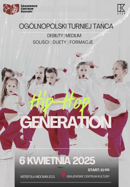 Grajewskie Centrum Kultury oraz Stowarzyszenie Twórczego Działania BK Step zapraszają an kolejną edycję Hip Hop Generation. Turniej tańca przeznaczony dla dzieci i młodzieży.