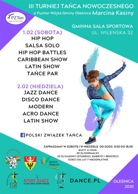 1 i 2 lutego 2020 w Gminnej Sali Sportowej przy ul. Wileńskiej 32 w Oleśnicy, odbędzie się III Turniej Tańca Nowoczesnego Polskiego Związku Tańca o Puchar Wójta Gminy Oleśnica Marcina Kasiny.
