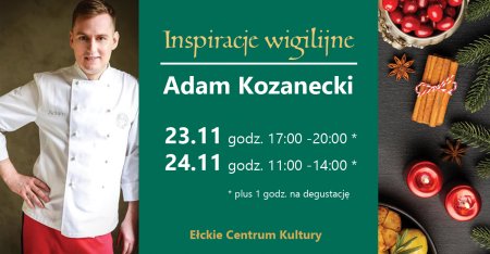 Zapraszamy na spotkanie kulinarne z finalistą czwartej edycji programu MasterChef Adamem Kozaneckim. Spotkajmy się w kawiarni Ełckiego Centrum Kultury. Być może takie, wspólnie przygotowane potrawy zagoszczą na waszych wigilijnych i świątecznych stołach: