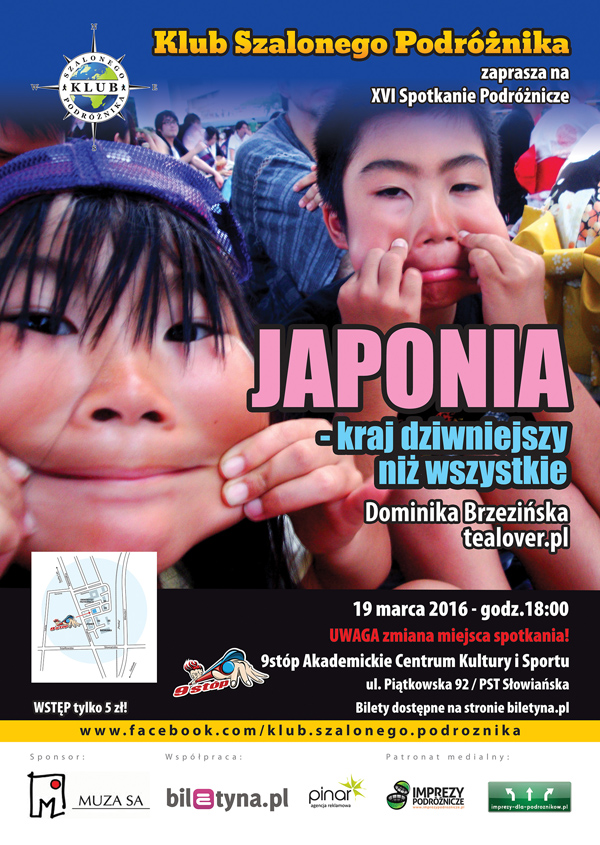 Z powodu swej odmienności obyczajowej i zawiłej historii Japonia zarówno odpycha jak i czaruje, gromadząc coraz większe rzesze miłośników Dalekiego Wschodu i przeciwników bezkompromisowej polityki rządu. Geograficzna izolacja pozwoliła mieszkańcom stworzyć unikatową w skali świata kulturę, która mimo swojej bezwzględności działa hipnotyzująco. O codziennym życiu i podróżowaniu w Kraju Kwitnącej Wiśni opowie Dominika Brzezińska, stażystka Uniwersytetu Tokijskiego, autorka blogu tealover.pl.