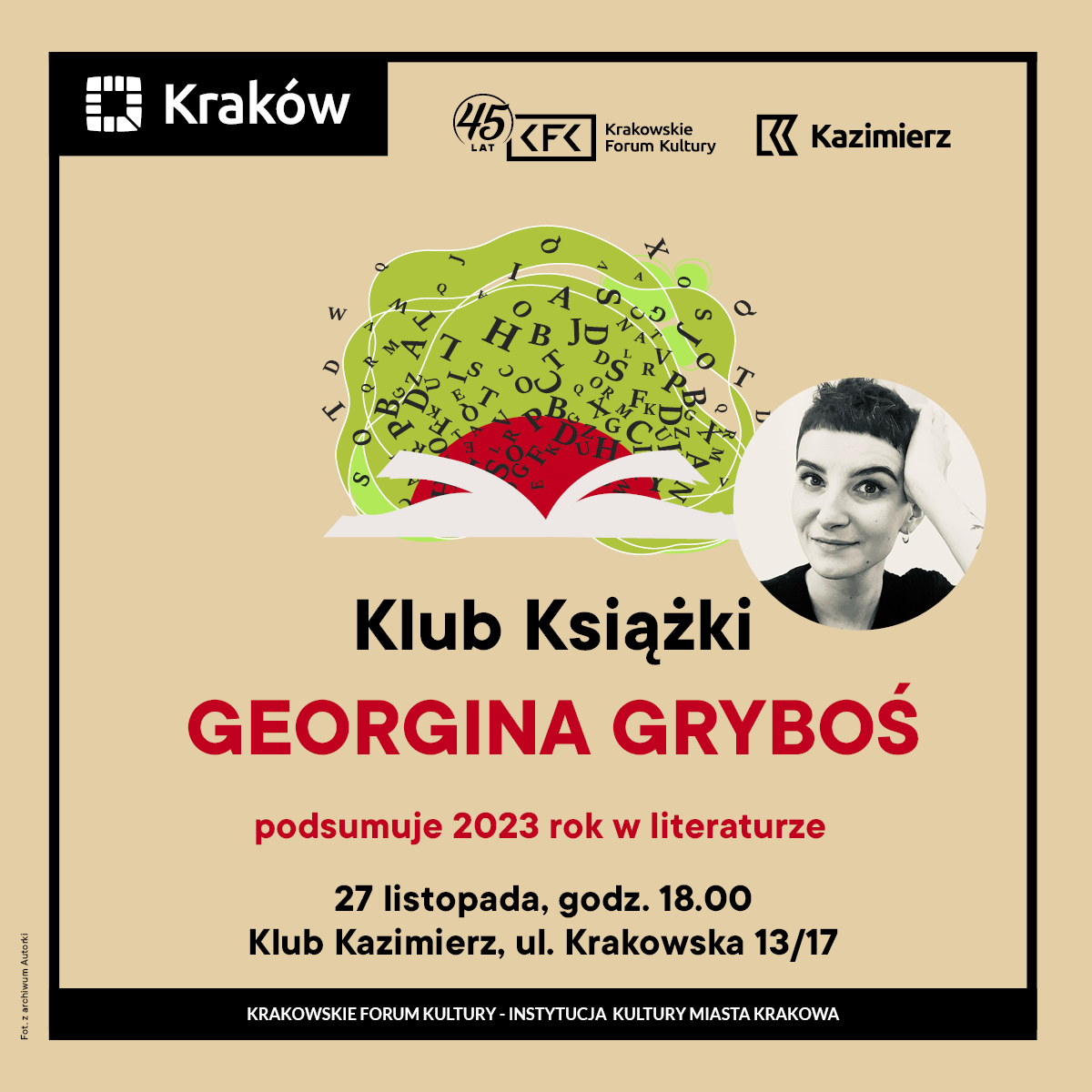 Działający w Klubie Kazimierz Klub Książki, to nie tylko możliwość wymieniania się lekturami, ale przede wszystkim spotkania wokół przeczytanych książek. Kolejne już 27 listopada, w poniedziałek, o godzinie 18.00. Naszą gościnią będzie Georgina Gryboś – redaktorka Radia Kraków Kultura, gdzie prowadzi audycje: Literacka Kavka - dla niedorosłych, poświęconą literaturze dla młodych odbiorczyń i odbiorców oraz piątkowy magazyn Dobre książki, w którym rozmawia z zaproszonymi gościniami i gośćmi o książkach. W piątkowe wieczory wybiera dla osób słuchających, wartościowe książki w formie audiobooków, których można słuchać w audycji Audioteka dla dorosłych. Prowadzi blog Literacka Kavka. Była redaktorką w Wydawnictwie Znak Emotikon.